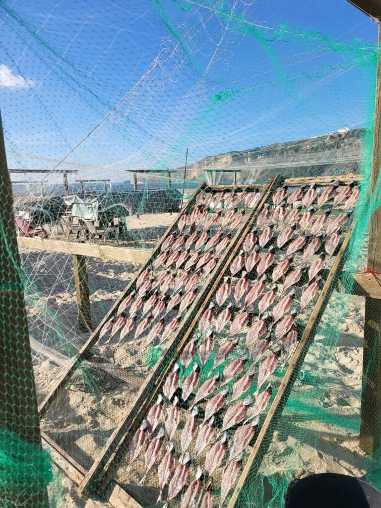 - Fish drying racks on the beach